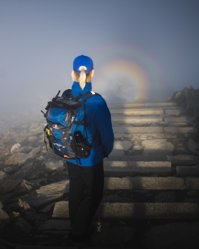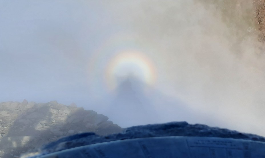 A Brocken spectre is when you see your shadow on the mist or cloud in front of you, with a rainbow halo around your head. Tiny water droplets in the mist/cloud scatter sunlight, forming a ‘glory’ (the circular rainbow-like halo). Your shadow (projected onto the mist/cloud) is at the centre of this halo — that’s the Brocken spectre!