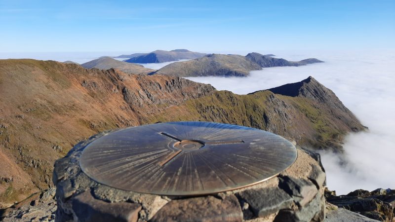 If the cloud’s top is at about 3000 ft, then the only peaks that will stick out will be the other 3000ers. If it’s a little lower, at about 2500 ft, then a host of other peaks will also be visible above the cloud, including Cader Idris, nearly 30 miles away as the crow flies.