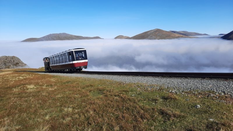 The train has just broken through the cloud near Clogwyn, and when it reaches the summit its passengers will be in for a real treat.