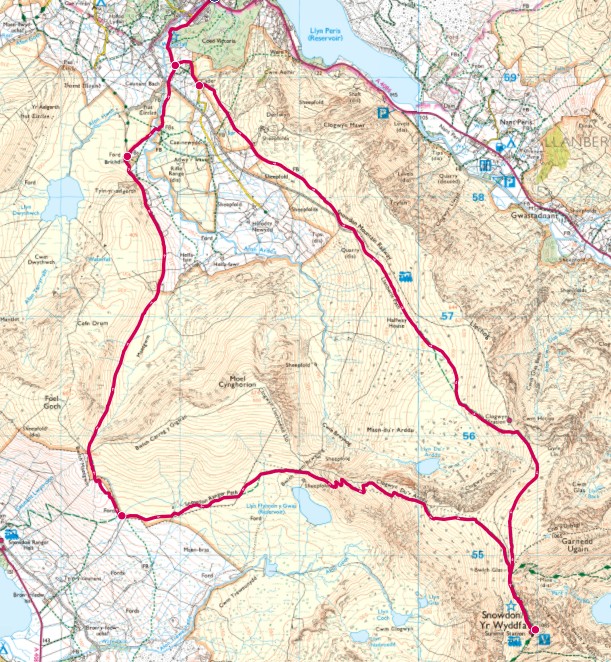 If done clockwise, the first part is a normal ascent of Snowdon on the Llanberis Path.