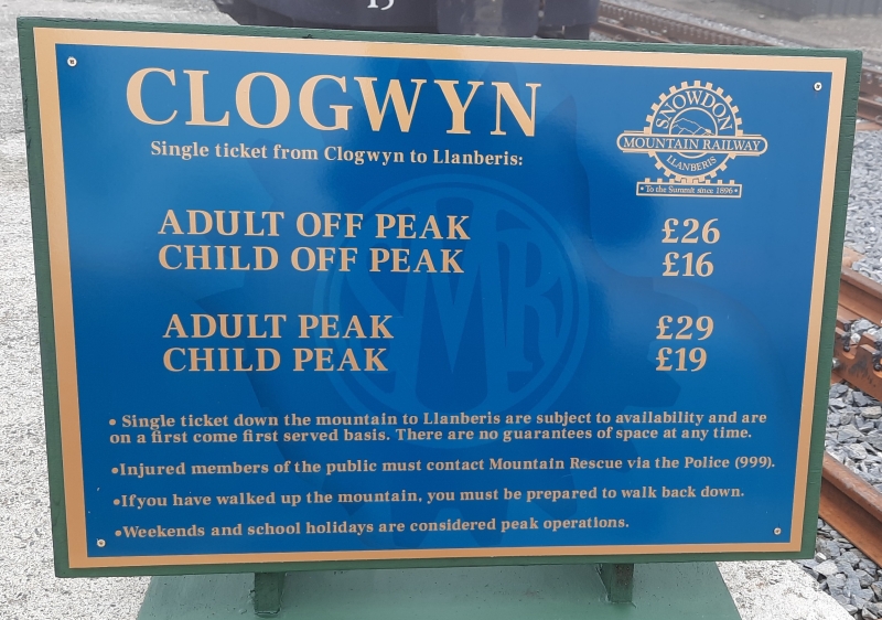 Display board at Clogwyn, showing single fares back to Llanberis